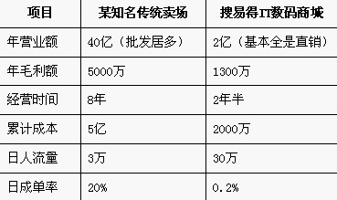 用了不到1/3的时间,1/25的成本,做到了1/4的毛利额,试想,传统卖场提升人流量基本还需要再建卖场,这个投入需数亿元,而网络电子商城则通过合理的市场营销费用就可获得相同的目标,其间优势确不言而喻。而且,随着信用问题的解决,随着人们对网络购物的接受与适应,日成单率将进一步提高,网络电子商城超越传统卖场的时间可谓指日可待。