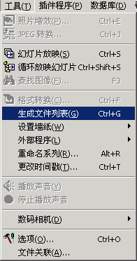 运行ACDSee,在其中选择浏览你需要建立文件列表的目录,此时在窗口的右边就会显示该目录中的文件。默认情况下你只能看到目录中的图像文件,那么你可以在工具栏中的“查看”进行切换,只要不选择“缩略图”,都可以看到全部文件。选中你需要建立文件列表的文件,然后点击菜单“工具/生成文件列表”(如图1),就可以生成一个文本,里面就包含了你所选文件的信息。