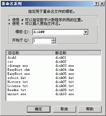 用一个具体的例子来说明,现要将D盘“disk”目录中所有文件修改为disk01、disk02、disk03...这样的文件格式。运行ACDSee,找到“disk”目录,选中里面所有的文件,然后打开右键中的“重命名”。此时会显示“重命名系列”的窗口(如图2),在“模板”中输入“disk##”,然后设定“开始于”为“1”,这样你就可以在下面看到设置后的效果。这里要说明的是,“#”符号代表数字,“*”符号代表原文件名,你可以灵活运用。