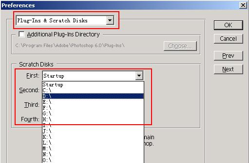 回答:我用的是6.0英文版的,但设置的地方是一样的,可以设置四个暂存盘。找到菜单上面“编辑”下面的“预设”里面的设置增效工具与暂存盘,设置第一个到你的空间最有富余的盘就可以了。(如图)