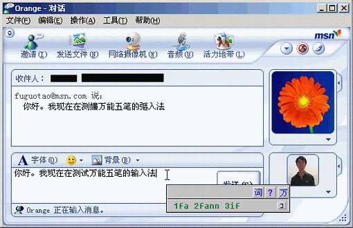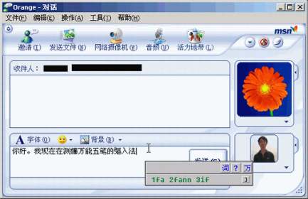在MSN Messenger对话框中,输入“你好。我现在在测试万能五笔的输入法”。这时有几个字符出现了乱码。