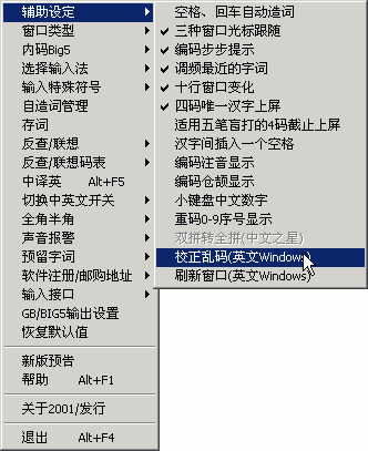 如何解决这个问题呢?这还得更改万能五笔的设置。在万能五笔的“输入法窗口”上单击鼠标右键,在弹出的快捷菜单中,选中“辅助功能”/校正乱码(英文Windows)。