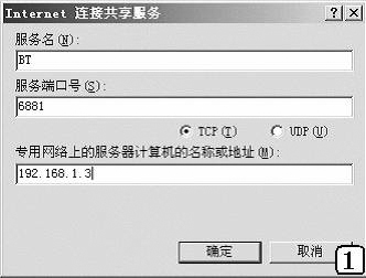 在该页中,名称可以随便填(如BT),“服务端口号”中填入6881,勾选TCP,“专用网络上的服务器计算机的名称或地址”中填入你用来进行BT下载机器的名称或IP地址,然后按“确定”保存。再用同样的方法增加 6882-6889端口的映射,把它们通通指向你开始指定的计算机。