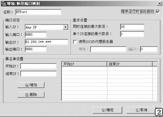 在名称里随便输入名称(如BTPort),在“输入IP”栏里填写你要用于BT下载的客户机的IP地址就可以了(或者选择“Any IP”把客户机使用的整个网段的IP添加进去也可以),在“输入端口”栏里输入6881,“输出IP”为自己机子上网代理服务器的公网IP,输出端口里输入 6881(输入端口和输出端口相同),其他的自己可以酌情进行不同的设置。这样设置就完成了,确认后再把刚刚设置好的那项启动就OK了。再用同样的方法把BT下载的端口6881-6889依次加入并启动即可。
