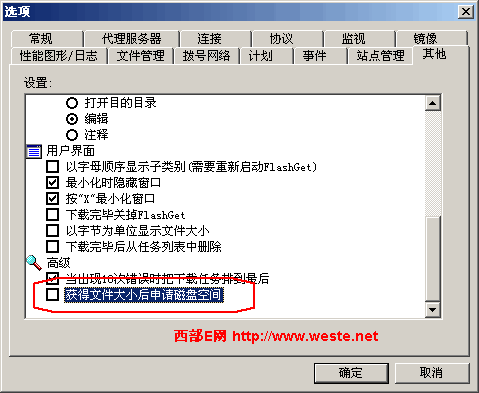 出现这种情况是GlashGet需要在硬盘上生成后缀为“.jc”的文件,它的大小与要下载文件的大小相同,而且下载完毕之后会自动更名。比如你要下载一个700MB的文件,FlashGet默认就要新建一个700MB的空文件,这样自然需要花费一段时间,不过我们可以在设置点击“其他”标签,去除“获得文件大小后申请磁盘空间”一项,这样每次下载文件的时候就不需要事先分配磁盘空间了。