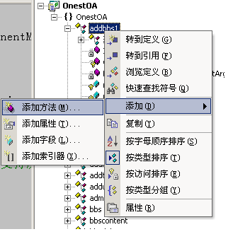 右击"addbbs"->选择添加,添加下面包括几个四项->添加方法 添加属性 添加字段 添中索引器 如图: 点击“添加方法”