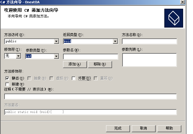 方法访问、返加类型、修饰符、参数类型可通过下拉列表框选择。