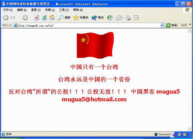 一位大陆黑客mugua5在3月20日改了一下台湾教育网(http://www.twlearning.net/ )上的头条,将其换为:《反对台湾 所谓 的公投!!!公投无效!!》,点击这文章链接会转到中国网络爱好者联盟专用黑页,并会听到雄壮的中华人民共和国国歌和鲜艳的五星红旗。