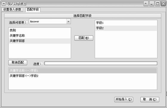 接下来在“匹配字段”选项下的设置就很关键了:在“选择匹配字段”下,点击左边的“关键字名称”,再点击右边的“字段1”(因为上例中字段1是“问”的信息),然后点“匹配”按钮将它们加入到匹配列表中;同理,将“关键字回答”和“字段2”相匹配(图3)。