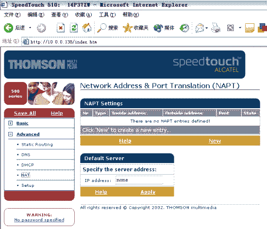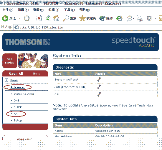 1、在地址栏输入10.0.0.138进入ADSL的Web设置页面,点左边的Advanced-NAT(图1)。