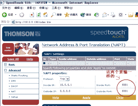 3、需要注意的是,Protocol一定要选Tcp,Inside IP填10.0.0.1,Outside IP填0.0.0.0,Inside Port和Outside port要填一样的,默认BT端口从6881~6999,具体要看你的BT客户端设定。按Apply确认(图3)。
