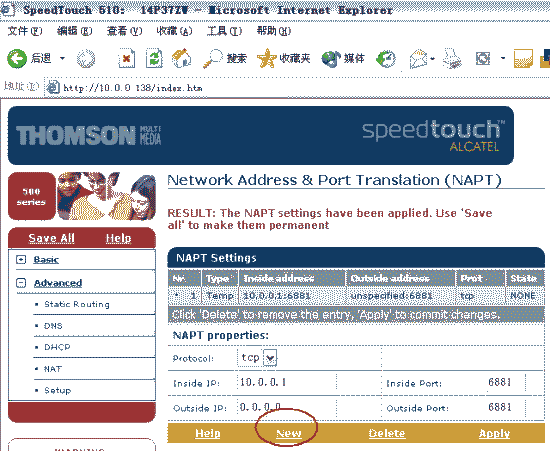 4、按了Apply后,我们刚才设置的端口映射就出现在NAPT Settings下方。此时若要再进行端口映射,可以点New,步骤和上面一样。(图4)