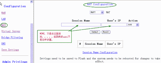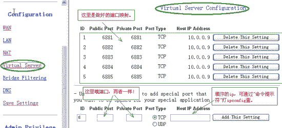 这里根据我的ADSL的设置以及网友们的成功经验,特地把ADSL分为有NAT(端口映射)与virtual server(虚拟服务器)设置和只有NAT设置的两种。