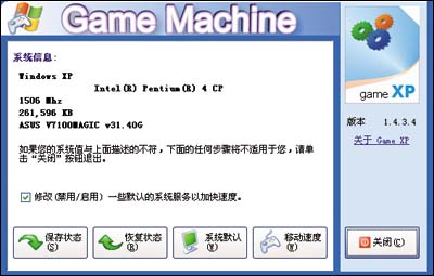 对于游戏玩家来说,如果该软件能正确地识别你的硬件及软件相关信息,我们就可以放心使用它。我们应该勾选“修改(禁用/激活)一些默认的系统服务”,之后选择“保存状态”,软件会自动将一些与游戏无关的服务禁用,最后点一下“移动速度”按钮,按提示重新启动电脑就行了
