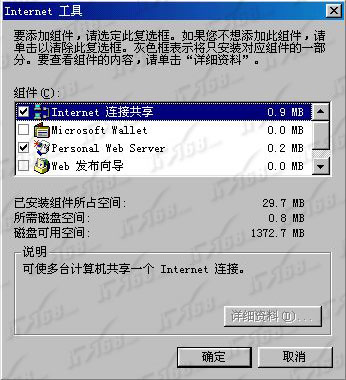 如果你使用的操作系统是Windows98第二版。首先,需要安装“Internet连接共享”——打开“我的电脑”→“控制面板”→“添加/删除程序”→“Windows安装程序”对话框。单击“Internet工具”→“详细资料”,在“Internet连接共享”前面打上勾,然后单击“确定”,系统将为你安装该程序(需要插入Windows98安装盘)。(图1)
