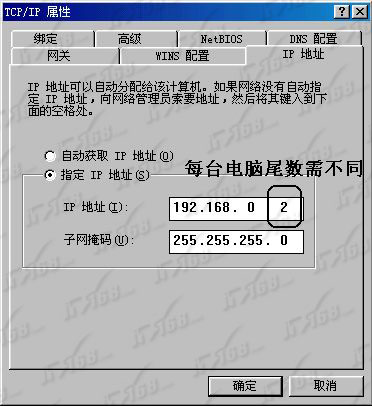 再设定客户机,同样双击打开网卡的TCP/IP协议,“DNS配置”项同上,再选中“网关”,在“新网关”一栏中填入主机的IP地址,既192.168.0.1,然后选“添加”。选中“IP地址”中的“指定IP地址”,将本机IP地址设为除192.168.0.1之外的任一尾数在1-255之间的地址,例如192.168.0.2或192.168.0.3……等等,总之其尾数要保证与局域网里的其它电脑的该地址不同。子网掩码同样为255.255.255.0。“确定”后重启电脑先主机拨号上网,联通后各客户机也可共享上网了。(图2-客户机设置)