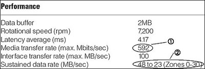 在硬盘中,真正重要的是内部持续DTR,它分为单磁道瞬间DTR与持续DTR两个指标,单磁道瞬间DTR的计算公式是“512字节×SPT×磁盘每秒所转圈数”或“512字节×SPT÷磁盘转一圈所用时间”,由于磁盘转一圈所用时间一般不能除尽,所以经常用前一种公式。持续DTR的计算公式则为“512字节×SPT×磁头数/总耗时”,其中“总耗时=(磁头数-1)×磁头切换时间+道间寻道时间+磁头数×磁盘转一圈的时间”。磁头切换时间一般在产品的用户手册中有标注,大约在1ms左右。单磁道瞬间DTR表明了硬盘实际上所能达到的最大内部DTR,持续DTR则体现了硬盘真正的数据传输能力。很遗憾的是,目前只有迈拓和IBM提供了内部持续DTR数据,其他厂商仍然用Mbps数值迷惑普通大众。但是,厂商心里是明白的,他们自己也不会混淆概念(只是没事偷着乐),在数据的说法上也是非常严谨,如果你哪天发现厂商公布的内部DTR使用了MB/s为单位,那么这很可能就是我们所真正需要的数据,而不要再用Mbps去除8了。