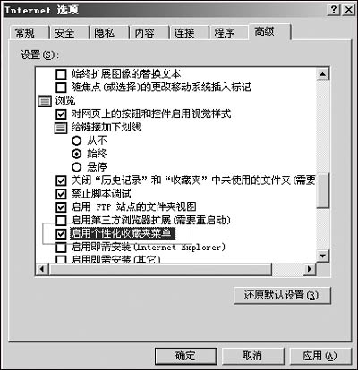 启动IE浏览器,依次点击菜单栏的“工具→Internet选项”菜单,在弹出的“Internet选项”对话框中,选择“高级”按钮,然后将“设置”列表框中的“启用个性化收藏夹菜单”选中,如图所示,即在复选框中打上对勾,点“确定”按钮。