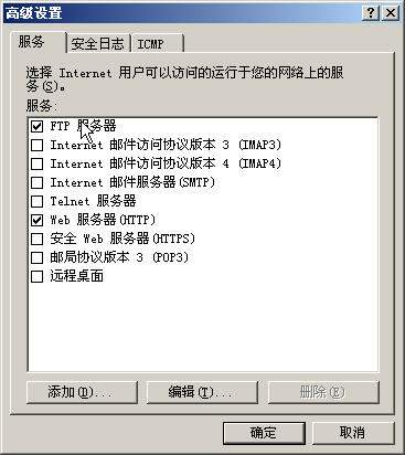 这里所说的常规服务是指我们常常用到的WWW、FTP等服务。ICF在默认情况下提供了几种常用服务供我们设置。点击“高级”选项卡中的“设置”按钮,进入“高级设置”对话框。在“服务”选项卡中,提供了常用服务的列表,如果我们的服务器需要提供FTP服务,则只须勾选“FTP服务器”选项(图1),在打开的“服务设置”对话框中保持默认的计算机名即可。