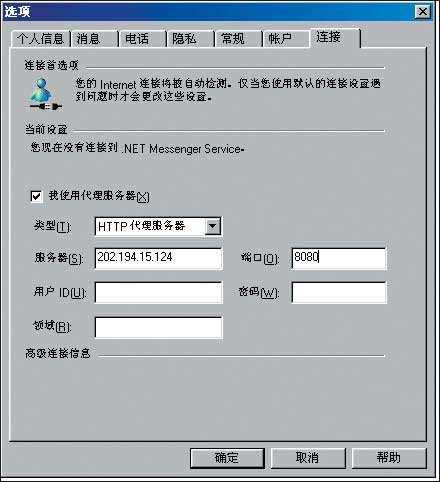 目前,不少大学都通过教育网接入Internet。出于费用方面的考虑,学校一般都不会开放访问国际网的功能,因此,深受大家喜爱的MSN聊天软件也就无法使用了。最近,微软给出了MSN的官方教育网代理地址:202.194.15.124:8080,可以帮助以上无法访问国际网的用户开通MSN。因为这是微软所提供的官方代理地址,速度和时效性方面应该有保证。打开MSN,点击“工具”菜单下的“选项”,再选择“连接”标签,在“我使用代理服务器”前打上勾,在“类型”中选“HTTP代理服务器”,“服务器”一栏中填入202.194.15.124,“端口”中填入8080(图1)。填完后点击[确定]按钮使之生效。现在,你就可以在教育网内轻松地使用MSN和各路好友神聊上一番了。