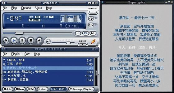 打开Winamp播放器,速配歌词将自动运行,并显示一个歌词窗口。双击Winamp播放列表中的文件,开始播放歌曲,这时速配歌词就会自动找到匹配的歌词,并且显示出来。歌曲播放到什么位置,速配歌词就会以高亮显示出来,还会自动滚动,省去了键盘和鼠标的手动操作,是不是很轻松?