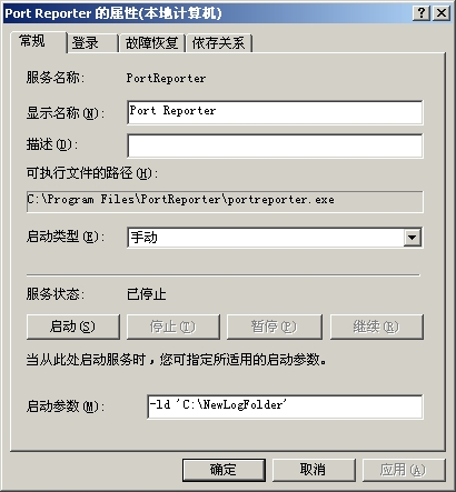 3.双击服务列表中“Port Reporter”,在弹出窗口的“启动参数”文本框中输入“-ld 'C:\NewLogFolder'”(见图),其中“C:\NewLogFolder”表示修改后的日志存放目录。这里需要注意的是设置的目录名必须用单引号括起来。