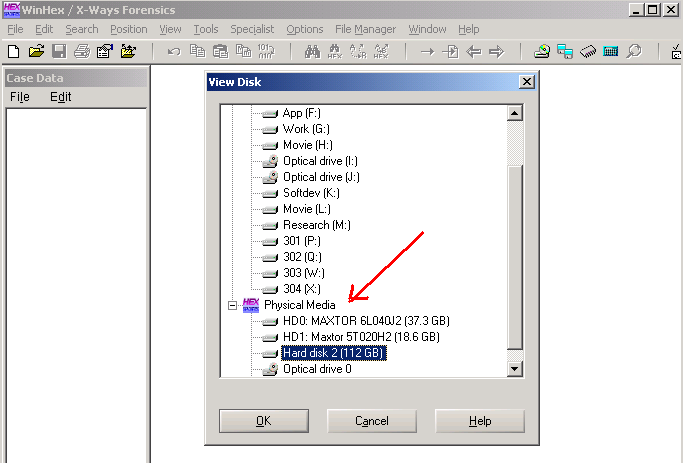 2 粗略查看硬盘数据。运行winhex或者RunTimes的磁盘工具diskexplorer,(其他的可以进行磁盘编辑的软件也可以),如图1,选中需要的物理硬盘,申明一点,贴图时候那块硬盘不在了,所以这里仅仅是作个例 子说一说。然后拖动滚动条,浏览一遍整个硬盘,可以看到一些有意义的字符串,还可以见到大批的零数据,当然更多的是看不懂的内容。这个没有关系,至少目前说明硬盘没有什么明显的物理损坏,或者逻辑坏道。