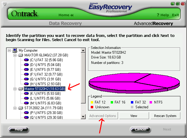 再一次运行Easy recovery 6,使用Data recovery 里面的AdvancedRecovery工具,如图2所示,当硬盘上没有分区信息时候,红色箭头所指的Advanced Options按钮是可以选择设定的。第一次自动寻找的时候,就是使用了缺省的设置,所以搜索失败,根据前面的分析,设定搜索范围从16000个扇区开始,分区类型选择fat32,fat的匹配模式选择忽略fat表(缺省时候是最佳匹配),然后就可以看到 Easy recovery 6不断的显示出查找的文件。