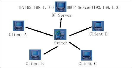 参与测试的有五台机器,网卡和交换机都使用100M的,虽然机器数目和真正的WAN相比是少了很多,但是只要能说明问题就行,而且在这个100M的网络环境中,带宽已经获得了彻底的解放!5台机器中,其中一台将被配置成真正的BT服务器,而其他的4台机器作为BT的客户机从服务器下载数据!BT服务器的IP地址为:192.168.1.100,同时该服务器被配置为DHCP Server,其余的4台客户机从该服务器获取IP地址,这样做是为了尽量避免IP地址冲突,而且无须设置IP,自动获取即可!