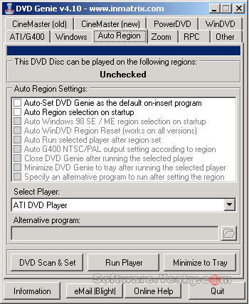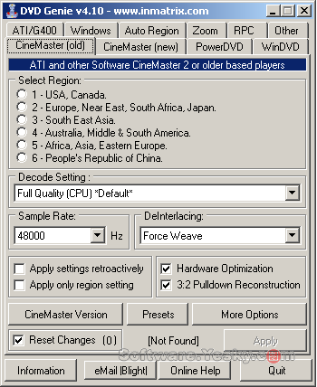 DVD Genie是一款小巧玲珑的DVD播放辅助工具,它可以允许你,轻松修改各种DVD播放软件隐藏的设置选项,其中最“拿手”的当然是破除区码限制。该工具支持PowerDVD、SoftDVD、WinDVD、ASUSDVD、XingDVD、VaroDVD等常见的DVD播放软件。与其他DVD播放辅助工具相比,DVD Genie的功能有点“单薄”,不过其区码破除功能,还是非常吸引人的,不少玩家都说它的破解成功率非常高。