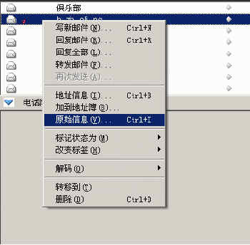 在Foxmail中点选要查询地址的信件按下“Ctrl+I”组合键,查看邮件的“原始信息”也可以在邮件上右键点击选择“原始信息(V)”(如图所示),在弹出的窗口中,看到“Received from xx.xx.xx.xx”,如果对方是直接用Foxmail发送的,这里的便是他真实的IP地址了;但有些人喜欢登录到Web上去发送,如163或者SOHU等,那这里看到的便是163或者SOHU邮箱所在的地址,并非对方真实所在。别急,在接下来的信息中,我们会看到字样“X-Originating-IP xx.xx.xx.xx”,这个才是我们想要的。