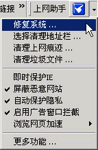 (1)点击IE工具栏上上网助手蓝色图标右边的向下箭头,选择“修复系统...”,如图1
