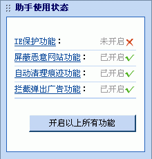 如何知道是否已经启用了“即时保护IE”的功能呢?很简单,去 assistant.3721.com,页面右边列出了当前的状态(如图3)。如果发现这个功能没有开启,点击“开启以上所有功能”即可。