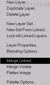 3、按住Alt键(Mac机请按Option键),同时单击图层面板右上方的小三角箭头,打开菜单,这时必须按住左键不放,否则菜单只会闪现一次。按住左键不放并指向命令“Merge Linked”(合成链接图层),单击该命令。