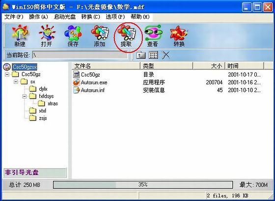 能打开也就成功了一半,现在就开始最重要的一步──提取。点击提取文件图标(图2) ,选择目标文件存放地址,点击确定。WinISO就自动开始提取镜像内的文件到目标文件中。稍等片刻,文件就提取完毕,然后我又用它将提取出的文件制成ISO镜像,教学课件又焕发青春了。而提取的文件内容也丝毫未改变。