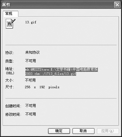 第一步:首先打开光盘界面,找到要保存的动画。在该动画上单击鼠标右键,选择“属性”,在打开的对话框中把地址(URL)全部复制下来(复制方法:按住鼠标左键,把地址拖蓝,在其上面单击右键选择“复制”)。其地址类似于mk:@MSITStore:E:\文学书籍\中国电脑教育报2003.chm::/1713_files/13.gif,如图1所示。
