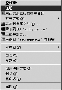 好了,现在随便找一个DLL文件试试,在其上点右键,在右键菜单中就会出现“注册/反注册”的选项(如图所示)。这样,我们就可以通过选取相应的选项来注册/反注册选项的DLL文件了,十分的方便!