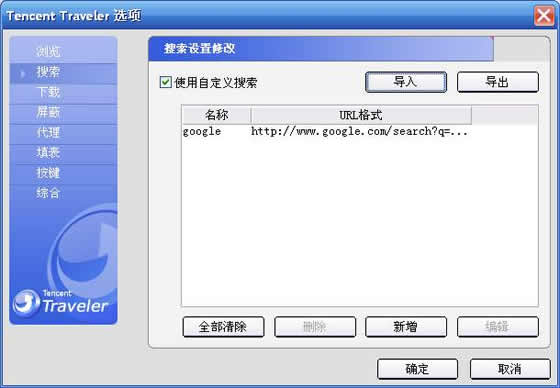 笔者首先想到的是在TT的“工具→TT选项→搜索”中进行更改,这里有一个“自定义搜索”的复选框,选中后点击“导入”按钮,勾选“确定”按钮,接着将搜索框右侧的“QQ搜索”更改为“Google”,这下终于可以在搜索框中使用Google进行搜索了。(如图1所示)