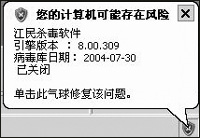打上了Windows XP SP2补丁,安装了KV2004,系统会时时提醒你哪种状态和环境下系统是不安全的,当你打开KV2004的实时监控,则系统提示你的杀毒软件“已是最新并启用了病毒扫描”,如果你关闭了病毒监控,就会在屏幕右下角出现一个打上叉号的小气球,提示你“计算机可能存在风险,江民杀毒软件已关闭”,开启病毒实时监控后小气球则消失,如图所示。这样,用户就再也不用担心因为忘记升级杀毒软件病毒库,或没有打开杀毒软件实时监控而感染病毒了。
