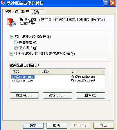 一般打开金山词霸(这里以词霸2005版为例)mcafee会出现报警,这个时候你可以如打开mcafee的控制台,双击buffer overflow protection,打开其属性,点击ADD,大家仔细看报警内容,该被拦截的进程是:C:\WINNT\explorer.exe::VirtualProtect bo:stack
