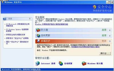 装好XPSP2第一次启动系统后可以看到这个安全中心窗口(如图1所示),它是一个基于Web页面的应用程序,在这里可以直接查看相关安全选项的设置情况,并对它们进行设置。