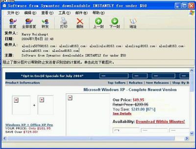 OE中还增加了一个最初出现于Outlook 2003的新功能,就是禁止从互联网下载图片。以前我们都知道,如果收到垃圾邮件一定不能回复,因为发送者只是向随机生成的地址发送邮件,而并不知道这个地址是否真实,你一旦回复了发给你的邮件,那无异于向发送者宣告你的存在。这一点大家都记得很牢,不过现在垃圾邮件制造者又有了新花样。