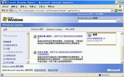 WindowsUpdate网站可能是大多数人访问最多的补丁下载网站了。V5版本的WindowsUpdate在XPSP2里面全面启用(如图6所示),新版本的WindowsUpdate将更新分作2个层次:快速和定制。快速安装模式只下载重要更新,而定制更新模式可以定制需要的更新程序。另外,V5版的WindowsUpdate允许隐藏更新,对于不需要的更新,用户可以将它们隐藏。下次访问WindowsUpdate的时候将不再提示是否安装被隐藏的更新。