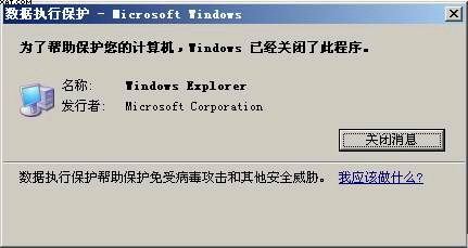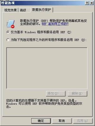 数据执行保护(DEP)是一种基于硬件的、防止缓冲区溢出的一种技术(图7),它能够让CPU对内存数据区域标记为只读,避免非正常代码无意中被执行。通过这种方式,当某个发动攻击的蠕虫或病毒将程序代码插入到一块被标记为仅包含数据的内存部分时,应用程序或 Windows 组件将不会运行这些代码。系统将给出相应的提示信息(图8)。