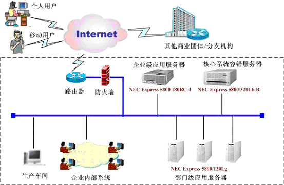 部门级的复杂运算,是制造业信息化网络的特点。无论是生产部门的调度和自控,还是研发设计部门的数据模拟,以及相对其他行业规模更大的驻外地销售和服务部门日常办公,都需要有比其他行业性能更强的部门级服务器。NEC二路服务器(NEC Express5800/120Lg)为部门级应用提供了游刃有余的计算性能与强大的安全可靠性。它支持2 个Intel Xeon 处理器,具有强大的计算能力,能配备多达8GB 带纠错功能(ECC)的高速内存和最大879GB的硬盘,这很有利于存储生产车间产生的海量临时数据,对外地分公司的内部管理也能给予充分的支持,使得部门级的网络应用具有高度的自主性,不至于完全依赖中心网络。