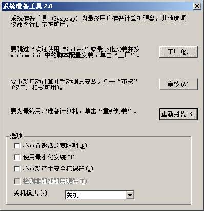 双击工具包中的sysprep.exe,选择“选项”下的“使用最小化安装”、“关机模式”下的“重新启动”(见图)。设置好这两项后单击“重新封装”,电脑就会重新启动。