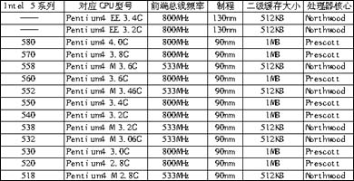 大家都知道,先前Intel处理器一般都以主频命名,比如常见的Celeron 1.7G、P4 2.8C等等,而现在Intel的处理器却采用另类方式命名。高端处理器以“7”开头,如即将发布的高端处理器720,采用Prescott/LGA775核心,3.73GHz的实际频率,1066MHz的FSB(前端总线频率),2MB L2(二级缓存)支持HT(超线程技术)。而新的中端主流的处理器以“5”开头,值得大家关注的是型+的方式以“3”开头,前期主要以Prescott/mPGA 478打头阵,后期估计应该是Prescott/LGA775核心的天下。